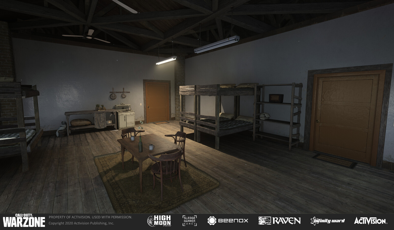 The housing at the docks in Warzone's Caldera map. This building contained bunks and dining area, a garage, and a small office. I tried to differentiate the three different areas of the housing using light colors.