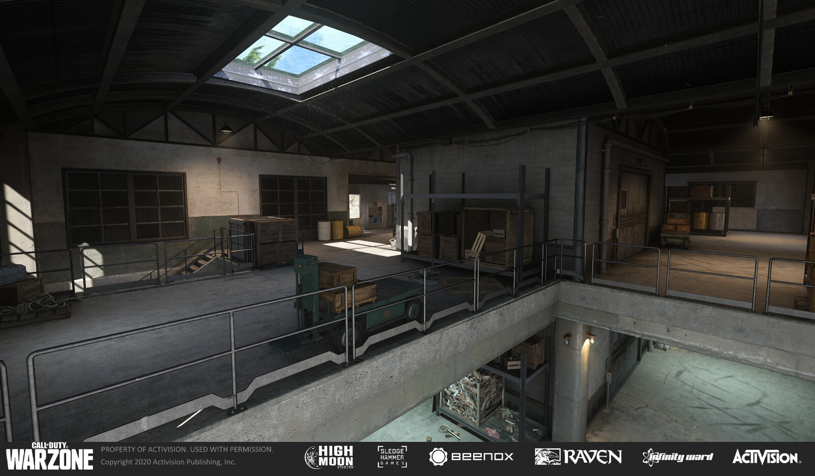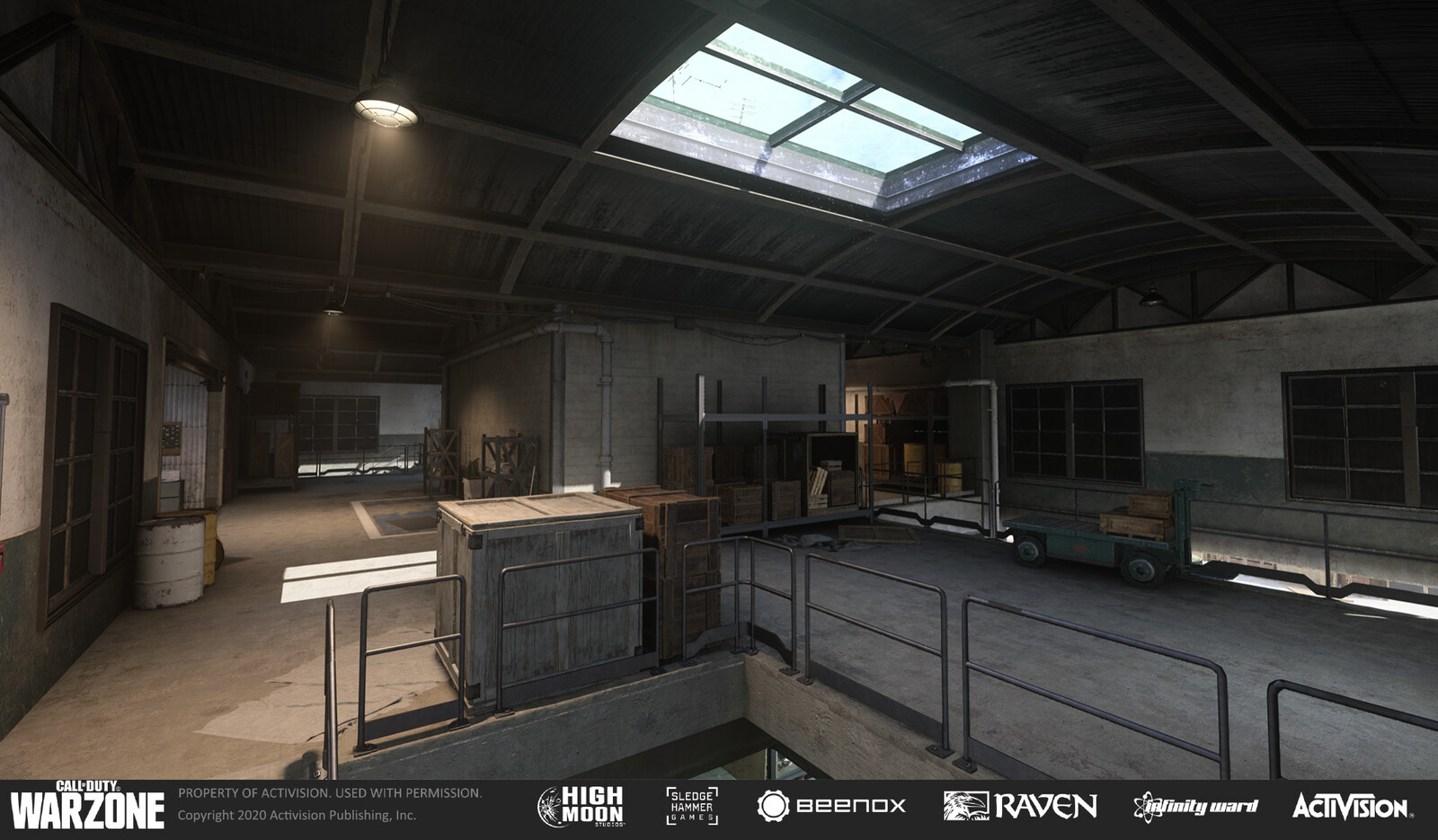 The warehouse in Warzone's Caldera map. This building is located in the docks area of the map. To differentiate the two levels, I kept cooler lighting in the bottom level, and warmer lighting above.