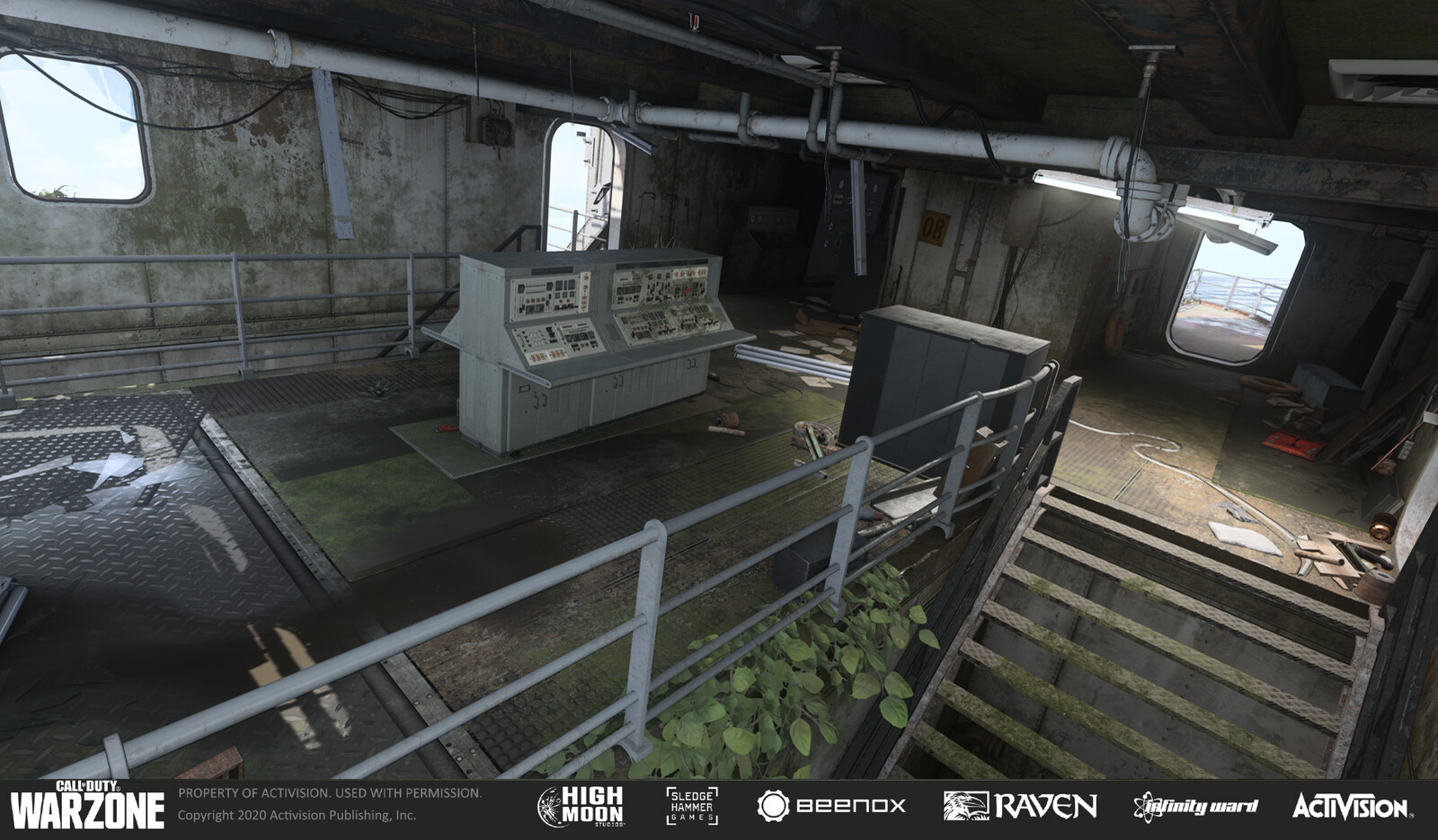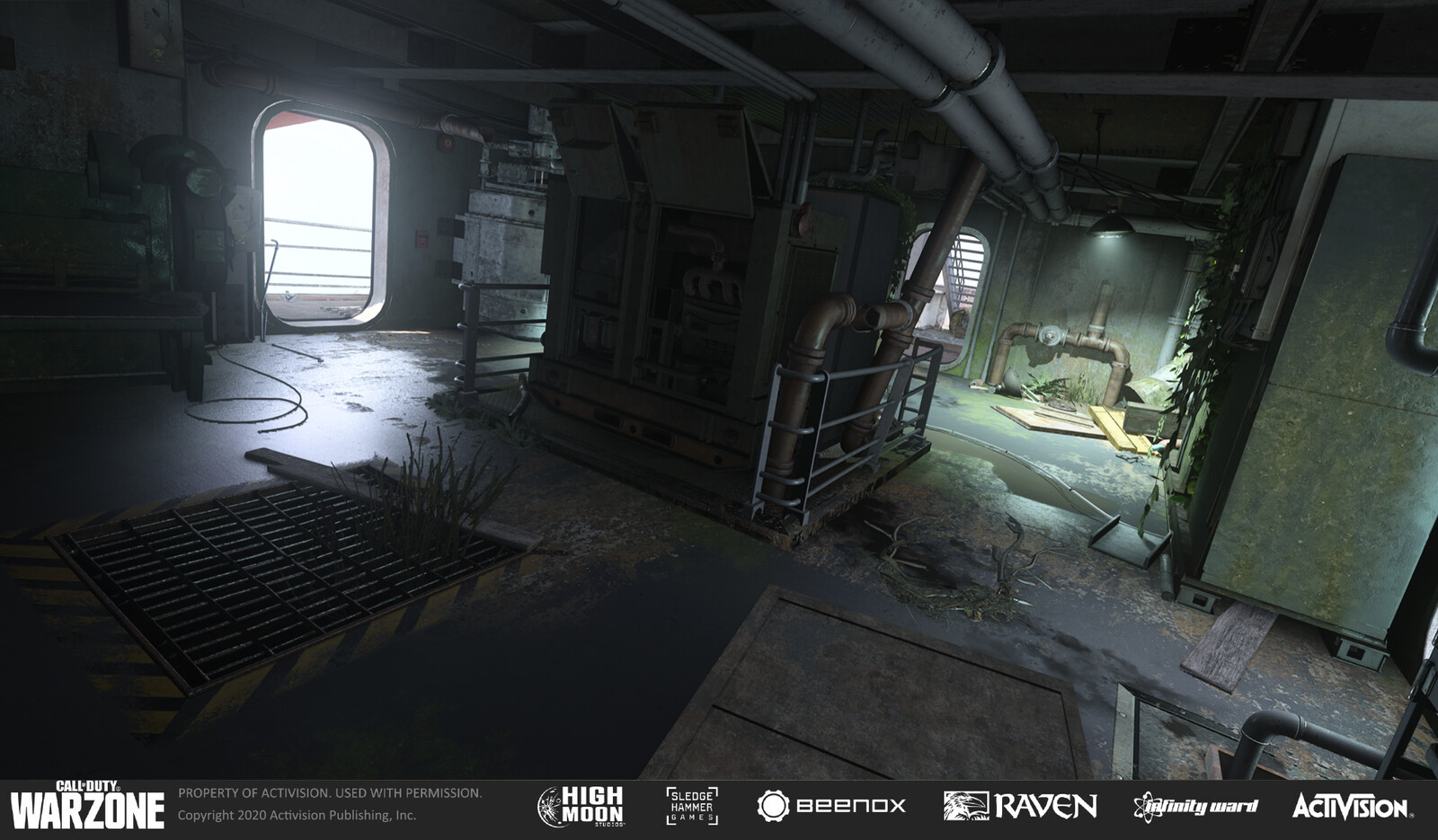 The shipwreck in Warzone's Caldera map. This shipwreck is located in the village & ruins section of the map. The upper level had sunlight coming in, so I kept the lighting more neutral. The dark underbelly of the ship was given a cold, creepy tone.