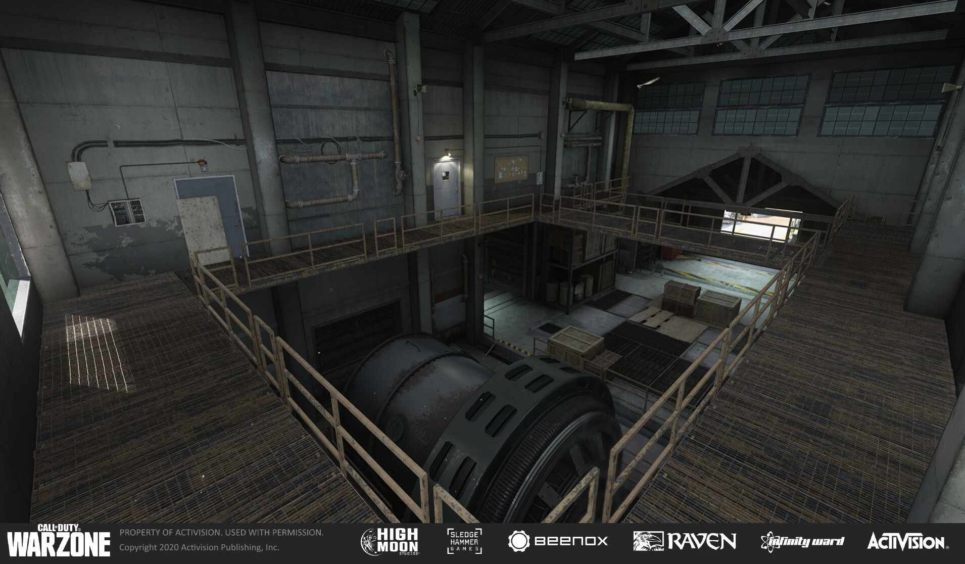 The loading yard warehouse in Warzone's Caldera map. This building was in the docks section of the map. I used cool tone lighting throughout the mid part of the building, warmer tones on the player path on the sides, and more neutral tones on the second floor.