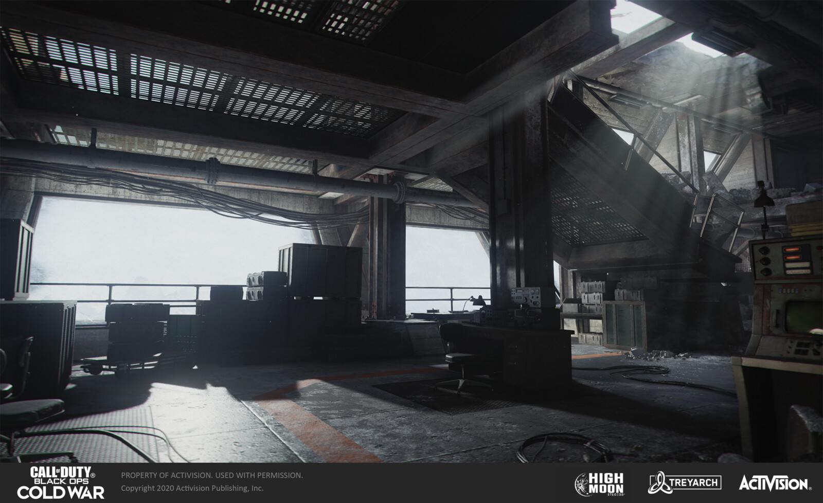 The satcom building featured in the "Echoes of a Cold War" level in Black Ops: Cold War. The satcom building is an iconic structure from the level. It's a combat level, so I wanted to ensure players had plenty of visibility while still breaking up the playspace with shadows.