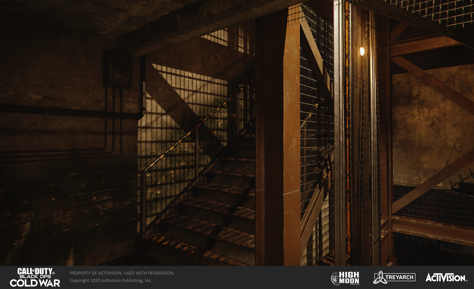 The tunnels featured in the "Echoes of a Cold War" level in Black Ops: Cold War. The tunnels begin outside, with a zipline section, and then go into a dark, abandoned tunnel system. The player goes up an elevator shaft and reaches the entrance to an abandoned base. I wanted to contrast the entrance & exit's colder toned sunlight with a warmer tone for the elevator.